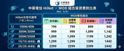 此外,中華電信同步推出「家速方案」,讓用戶額外用 100 元起加購 MOD 套餐,可以選擇電視、運動頻道或是影劇。若以 100M/40M 為例,新的促銷方案月費為 699 元,額外加 100 元至 799 元可以自選 20 個頻道或是選擇家庭特選餐,額外搭配影劇館只要 899 元,若是全選則是 942 元。