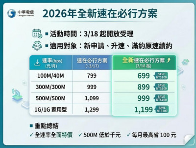 中華電信即日起(18 日)至 5 月 22 日推出全新「光世代電路及 HiNet 上網」促銷方案,相比先前「速在必行」方案有 100 元的降價幅度,高速雙向 500M 只要 1,000 元有找。