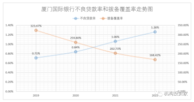 亦或是廈門國際銀行對不良貸款率的放松把控,使得其撥備覆蓋率連年跟着下行,由2019年的323.47%降至2022年的168.42%,累計下降155.05個百分點。