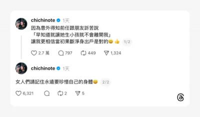 我是廣告 請繼續往下閱讀 織織日前曾在Threads發文,表示意外得知前任跟朋友訴苦時說道:「早知道就讓她生小孩就不會離開我」,這句話讓織織更加堅信自己當初果斷淨身出戶是對的選擇。織織也不忘喊話大家:「女人們請記住永遠要珍惜自己的身體」,這則貼文在當時引發許多人的共鳴,還驚呼前任想法太可怕,「好噁,不適合當爸爸的人」、「真的是好險織織果斷遠離」。