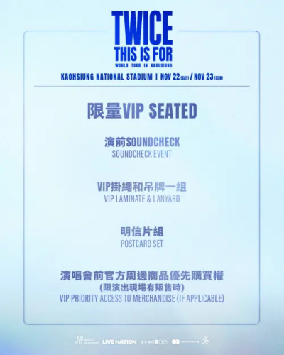 TWICE去年在高雄開唱最貴票價為VIP 8800元,當時也有送限定禮物,內容為看綵排、VIP掛繩、吊牌組、明信片組、官方商品優先購買權;這次的台北場一樣也有禮包,不過主辦單位事前僅透露「VIP限定小禮」,稍早已揭曉,台北VIP歌迷可以拿到毛巾、杯套、明信片組、證件套、鐵牌、VIP證以及看綵排,許多粉絲打開驚喜連連,直呼台北場的禮物比高雄場的還要高級。