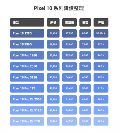 如果鎖定更高階的Pixel 10 Pro系列,整體降幅落在10%~25%。像是Pixel 10 Pro 128GB,已降價約8,200元,通路價已來到25,290元;Pixel 10 Pro XL 512GB更是便宜9,000元,約34,990就能入手。