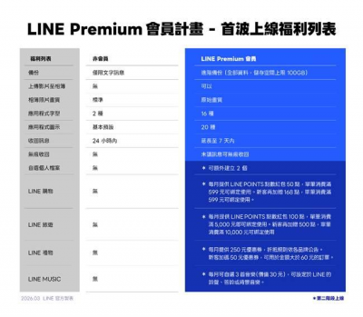LLINE 表示,「LINE Premium」會員將從今日起批次發布,用戶可以在手機的 LINE 設定裡看到「LINE Premium」的選項,點擊之後就可以選擇訂閱會員,預計功能將分成兩梯次上線,第一個階段會有進階備份、相簿升級、無痕收回、應用程式字型與應用程式圖示等 5 項進階功能,4 月開始的第二階段則有「自選個人檔案」功能,與LINE 購物、LINE 禮物、LINE 旅遊、LINE MUSIC的LINE Premium會員專屬優惠。