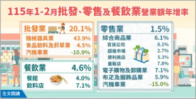 我是廣告 請繼續往下閱讀 1月、2月統計往往都會選擇合併一起看,避免因為春節連假落點不同而產生差異。據統計,批發業1、2月營收2兆5705億元,創歷年同期新高,年增20%,都與AI及高效能運算等應用持續拓展,如機械器具批發業就是受到伺服器、記憶體及相關電子零組件出貨暢旺,年增43.9%。