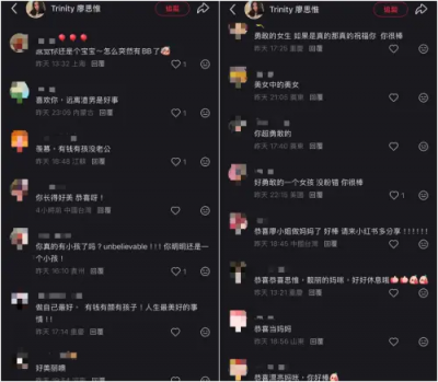 而廖思惟擁有22萬粉絲追蹤的小紅書帳號,昨日開始也湧入大量網友留言,力挺她未婚生子的決定,恭喜廖思惟當媽,「富家女真的不需要婚姻,有個孩子就夠了,這樣最好」、「祝福,可以當最美辣媽」、「做自己最好,有錢有顏有孩子,人生最美好的事情」、「恭喜,最勇敢的媽媽」、「羨慕,有錢有孩沒老公」。