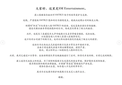 SM娛樂在聲明中指出,近期SMTR25練習生遭到部分人士多次擅自闖入宿舍,還對成員進行過度肢體接觸,甚至有逼迫練習生和自己一起搭計程車的狀況,而這些行為已經超過粉絲該保持的界線,也讓練習生們的心理造成了嚴重的影響,使得他們承受了巨大的不安。