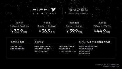 7 月 15 日,高合旗下第三款車型 HiPhi Y 上市,新車定位於純電中大型 SUV,共推出四款車型,售價區間爲 33.9 萬元 -44.9 萬元。其中,先鋒版和精英版第搭載了 76.6kWh 電池組,售價分別爲 33.9 萬元和 36.9 萬元;長續航版搭載 115kWh 電池組,售價 39.9 萬元;旗艦版搭載 115kWh 電池組,售價 44.90 萬元。值得注意的是 , 這個價格與月初的預售價 36.9 萬元起相比便宜了 3 萬元。