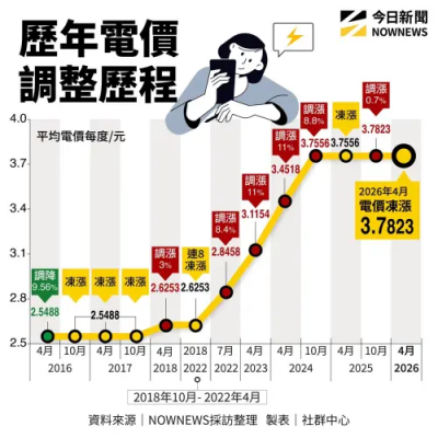我是廣告 請繼續往下閱讀 台電2025年因為遲遲等不到立法院通過撥補案後,於去年10月調漲民生電價,平均漲幅0.71%至平均3.7823元。電價審議會今日決議,考量到伊朗戰爭及國際關稅衍伸風險,為了穩定民生物價及產業競爭力,決議採取凍漲,價格維持3.7823元。