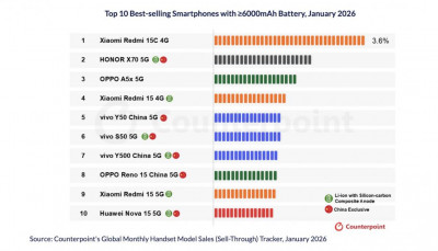 從2026年1月的銷售數據來看,全球6,000mAh以上電池手機暢銷排行榜前10名,全數由中國品牌包辦,且有6款採用矽碳電池技術。其中,小米的Redmi 15C 4G以3.6%市佔率拿下冠軍,親民價格成為最大優勢;而電池容量最大的則是HONOR X70 5G,高達8,300mAh。