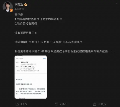李榮浩在微博曬出自己和中國著作權協會的郵件截圖,透露自己沒有讓單依純公開演唱〈李白〉,然而她卻還是在演唱會上唱了改編版的〈李白〉,為此李榮浩氣得說「看看哪一個牛逼(NB)的團隊,能把這個明顯的違法侵權案件給糊弄過去」,並透露自己與團隊已開始蒐證,不排除進一步走法律途徑。