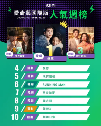 愛奇藝今(30)日公布3月23日到3月29日的人氣榜單,《逐玉》毫無意外地攻佔第一名,第二名則是白宇、章若楠主演的《冬去春來》,第三名是周也、翟瀟聞的穿越劇《你好1983》 。