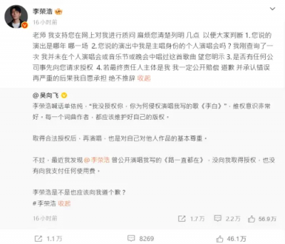其實昨日除了李榮浩開罵單依純外,作詞人吳向飛也突然點名李榮浩唱他寫的歌,沒獲得授權:「李榮浩是不是也該跟我道個歉?」巧合的是,吳向飛所說的這首歌,正是陳奕迅2008年推出的〈路一直都在〉,該曲確實由吳向飛作詞,但李榮浩表示他沒公開演唱過,要求吳向飛拿出證據。此事不知陳奕迅會站在誰那邊,網友也笑說陳奕迅簡直是無端躺槍,莫名其妙被捲入這場風波。
