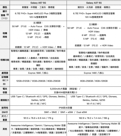 其餘規格上,Galaxy A57 搭載效能較優異的 Exynos 1680 處理器,並且最多提供 12GB 記憶體與 512GB 儲存空間;Galaxy A37 則為 Exynos 1480 處理器,兩款採用相同的 6.7吋 FHD+、120 Hz 螢幕以及 5,000mAh 電量搭配 45W 快充、IP68 防水防塵,完整差異可參考下圖: