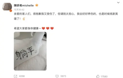 對於此次意外,陳妍希工作室也發聲明,指出她是在進行運動訓練時不慎受傷,醫師診斷確認是跟腱斷裂,目前已經完成手術,接下來將以靜養與復健為主,工作室也坦言,現階段將以她的健康為最優先考量,因此所有已安排好的工作都會暫停或進行調整,團隊也正積極與各合作單位協調,希望將影響降到最低。