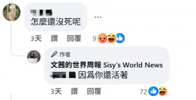 上個月底,陳文茜在粉專發長文,分享2012年赴紐約跨年的文字和照片,怎料,一名疑似使用假帳號的網友,留言咒罵:「怎麼還沒死呢?」陳文茜看到後罕見正面迎擊,親自回覆:「因為你還活著。」