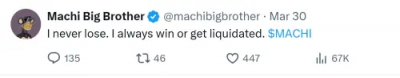 面對外界對其頻繁面臨清算危機的擔憂,黃立成展現出強大的心理素質。他3月30日曾在X發下豪語表示:「I never lose. I always win or get liquidated.」(我不會輸,我要嘛贏,要嘛被清算),這種不留後路的霸氣風格,讓不少保守投資者為他捏了把冷汗。