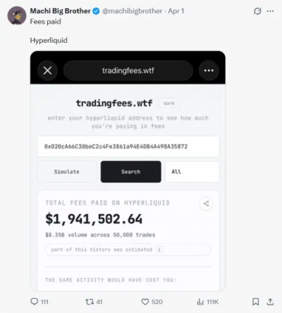 根據黃立成1日在X分享的截圖,他於Hyperliquid上的累計交易手續費高達194萬美元。如此高昂的規費,側面證實了他的實際交易量已達到了驚人的規模。除了手續費,根據他錢包地址查訊,其帳戶累積的平台積分(Points)也突破了46萬分,顯示黃立成在該平台的活躍程度早已位居金字塔頂端。