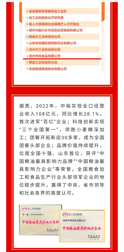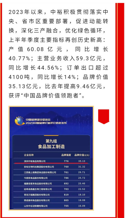 “2023年以來,中裕積極貫徹落實中央、省市區重要部署,促進動能轉換,深化三產融合,優化綠色循環,上半年季度主要指標再創歷史新高:產值60.08億元,同比增長40.77%;主營業務收入59.3億元,同比增長44.56%;訂單出口超過4100噸,同比增長14%;品牌價值35.13億元,比去年提高9.46億元,獲評“中國品牌價值領跑者”。”