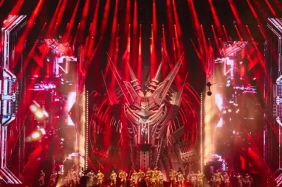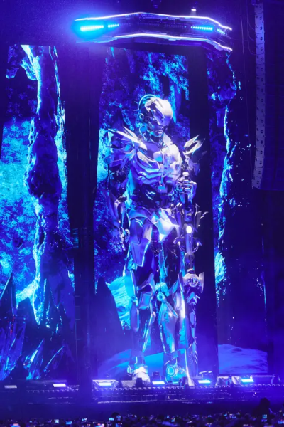 此次巡演為了呈現極致的沉浸式體驗,製作團隊動用了87台40呎貨櫃車將器材運入現場,光是舞台搭建就耗費15天。開場時,除了矗立在舞台兩側、高達12米的手工不鏽鋼機器人震撼人心之外,舞台中央更以視覺特效模擬出壯闊的冰封世界,隨後由雷射光切開大門,周傑倫自14米高的巨型機甲現身,代表王者歸來,搭配熱力四射的螢光舞群,一連帶來〈太陽之子〉與〈無雙〉,陽剛氣息與震撼音效瞬間燃爆全場。