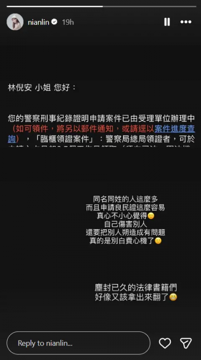 針對網友的爆料,林倪安在IG限時動態出示正在申請「警察刑事紀錄證明」(俗稱良民證)的受理資料截圖,欲證明自己沒有任何犯罪紀錄,她寫下:「同名同姓的人這麼多,而且申請良民證這麼容易。」