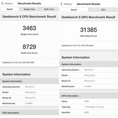 透過《Geekbench 6》測試iPhone 17e搭載的A19晶片效能,CPU跑分(圖左)與iPhone 17幾乎相當,但GPU表現(圖右)略低16%,顯示iPhone 17e在日常操作與多數應用情境下與iPhone 17差異不大,但在遊戲或影像處理等對顯示效能要求較高的場景中,則可能出現些微差距。