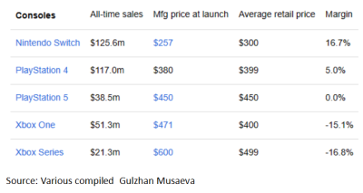 但事實上,在遊戲銷售市場,索尼旗下的PlayStation系列一直是領頭羊,全球總銷售近16億部;Switch在過去20年裏一直位居第二,全球總銷售約10億部,第三是微軟的Xbox,全球總銷售約7億部。但細分來看,PS4的利潤率僅爲5%,Xbox無論是One還是Series都是處於虧損狀態。