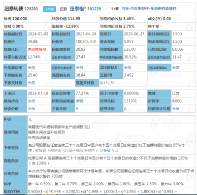 A股上市新債-鈕泰轉債,可轉債代碼:123201,轉股價114.93元,信用評級:A,發行規模:3.5億,稅後收益2.75%。