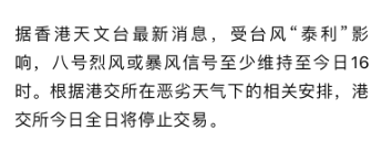 當日由於受台風-泰利的影響,港交所當日臨時停盤,導致北向資金不能流入A股。港股那邊的常態,一到台風天氣,總是出現台風導致港交所臨時停盤。
