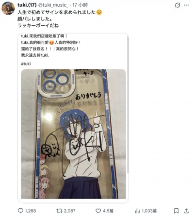隨後tuki.也在X轉發該貼文,並寫下「人生第一次被問能不能幫忙簽名,被認出來了,對方完全是lucky boy」,瞬間掀起網友暴動朝聖「tuki.人超級好!」、「一定是本人太漂亮,一眼就被認出來」;不過也讓許多粉絲相當不滿,認為該網友把tuki.的簽名、自己的打工場所發出來,是侵犯「覆面系歌手」的隱私,也會讓許多人不顧一切跑去現場造成困擾,甚至到tuki.貼文留言道歉「真的非常的抱歉,是我們這邊的人做得不好」,為此tuki.則回應「沒能一一給簽名是我們這裡比較不好哈哈。」