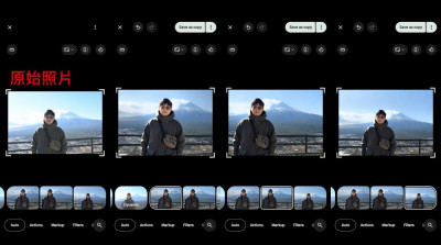 最左邊的圖片為原始畫面,透過「AI 增強」Google 相簿共給予了右側三張的選項。首先最明顯的是,Google 並不只有單純調整顏色與亮度,更進行了生成式 AI 的圖片擴張,主動挪移了人物的位置,替富士山的比例進行放大,但也因此可以發現後方欄杆有不協調之處。