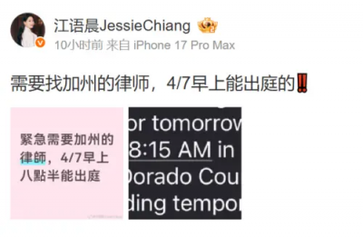 江語晨還在貼文附上圖片,圖中顯示,該場聽證會預計在2026年4月7日早上8點15分,於El Dorado County Superior Court(加州高等法院)第5法庭舉行,而文字後半部則被遮蓋。突然的緊急消息,也讓粉絲非常擔心,紛紛為她提供幫助,建議她透過港澳那邊的律師,可以幫助聯繫加州律師。而不久後江語晨工作室也透露已聯繫到律師,並感謝大家關心。