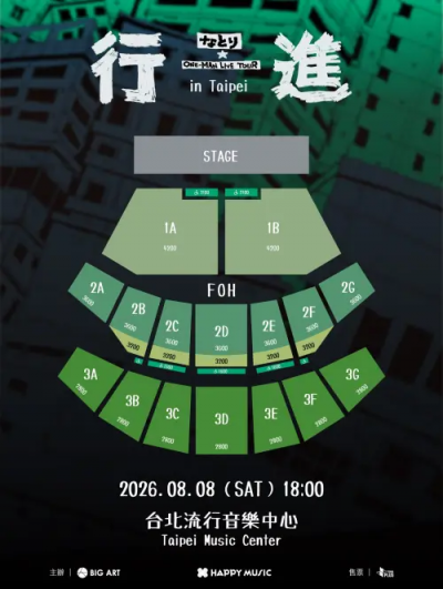 「 natori ONE-MAN LIVE TOUR ’Koshin (March)’ in Taipei 」將於2026年8月8日(六)晚間6點在台北流行音樂中心舉行,票價為新台幣4200、3600、3200、2800以及身障席2100(1F)、1600(2F)元,預計4月20至22日下午1點在遠大售票系統開放抽選,4月24日(五)中午12點發表抽選結果(視票券販售情況,將有不實施一般販售之可能),更多詳情可洽主辦單位大鴻藝術BIG ART官方社群專頁。