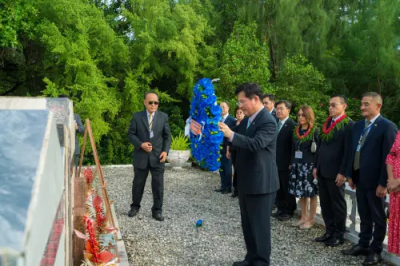 ▲林佳龍訪問馬紹爾群島共和國,前往馬紹爾國父卡布亞故居謁陵表達敬意。(圖/林佳龍臉書)