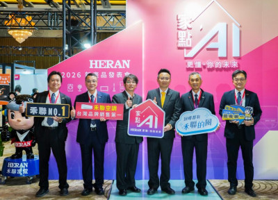 禾聯日前舉辦2026家電新品發布會,右三為禾聯碩董事長蔡柏毅、右二為總經理林欽宏。
