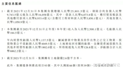 中國恆大集團剛剛發布2021年年報報表,恆大集團截至2021年12月31日止年度(本年度)收入爲人民幣2,500.1億元,毛虧損人民幣184.5億元。年內經營性虧損人民幣1,137.5億元,撇減發展中物業及持作出售之已完工物業、投資物業公平值虧損人民幣4049.5億元,土地被收回有關的虧損、金融資產減值損失及其他非經營性虧損人民幣1802.0億元,所得稅抵免人民幣126.8億元,淨虧損合計人民幣6862.2億元,日均虧損18.8億元。