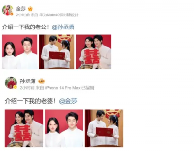 我是廣告 請繼續往下閱讀 金莎與孫丞瀟在今日分別於微博發出結婚登記時的合照,甜蜜寫下「介紹一下我的老公/老婆!」只見照片中,小倆口拿著「囍」字,頭靠頭甜笑看向前方,還有一起拿著結婚證書對視的照片,直接把外界甜翻,紛紛獻上祝福「恭喜恭喜!神仙眷侶,一定要狠狠幸福哦~」、「恭喜恭喜恭喜呀,終於修成正果,往後餘生都是甜蜜蜜的日子」。