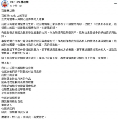 我是廣告 請繼續往下閱讀 林以樂在衝動發言後,今日於社群發長文道歉,認了在沒有搞清楚情況下,就因情緒上來,發表不適當內容,並表示因為家中發生火災,「作為陳情與協助受災戶,已無法承受過多的網絡資訊與批評」,承諾會好好反省。林以樂也透露已正式提出離開相信音樂,「我提出的言論是希望支持五月天,因為他們是我的長輩跟榜樣。我理解自己自己沒有這些資質,也願意主動退出華語樂壇,平息大家憤怒的情緒」,感謝網友讓她重新檢討自己,並請大家給她反省機會。關於林以樂是否離開默聲音樂,以及公司是否提供相應資源協助她目前身心狀態,默聲音樂回應《NOWNEWS 今日新聞》表示:「謝謝大家關心,默聲於公於私都盡力在提供藝人需要的資源」。