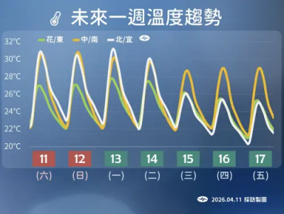 週三、週四(15、16日)將有微弱鋒面在北部海面附近活動,各地大致為多雲時晴,北台灣高溫略降,但整體仍偏暖;北部地區偶爾受到鋒面邊緣影響,可能出現局部短暫降雨。
