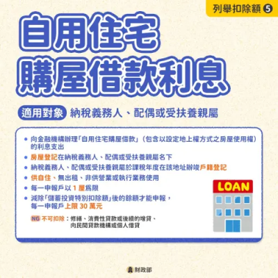 要選擇何種扣除額申報較能節稅,財政部表示,技巧無他,只要看申報時同一申報戶成員中,在114年內所支付的醫藥及生育費、人身保險費、自用住宅購屋借款利息支出、捐贈及災害損失等列舉扣除項目的金額總合,有無超過標準扣除額的額度,答案如果是肯定的,應該要選擇採用列舉扣除額並檢附證明文件申報,才能節稅。