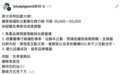 蒼藍鴿昨(16)日在Threads社群發文徵人,「團隊徵攝影企劃兼社群行銷,月薪35000~55000依經驗及專案完成度調整」,他透露這個職缺需要負責,「品牌視覺策略和社群經營、統籌醫療行銷攝影專案,從腳本企劃、現場拍攝到後期剪輯;並操盤社群內容,撰寫高互動文案」,不僅要管理社群,還要行銷品牌,甚至還需要參與現場拍攝以及後期剪輯,正常來說會由3個人負責的工作,卻只用一個人來完成,然而卻只能拿到比基本薪資高一些的3萬5千元。