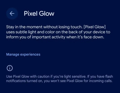 在最新Beta 4中,Google將其正式命名為「Pixel Glow」,相關描述也進一步揭露用途。簡單來說,這是一種會在手機背面亮起彩色燈光的功能,而且還帶有Pixel品牌特色。