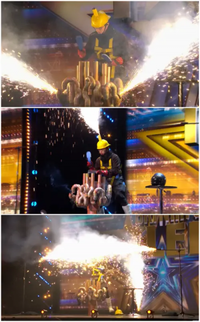 只見賽門坐在水管鼓中,一邊打鼓一邊吶喊炒熱現場氣氛,接著鼓架兩邊突然噴出煙火,讓觀眾驚喜連連,但評審艾莉莎(Alesha Dixon)似乎看不懂這種表演風格,第一個按下X。而阿民表演到一半,頭上的安全帽也跟著噴出火花,將演出拉到高潮,不過又被評審KSI澆冷水,按下第二個X。