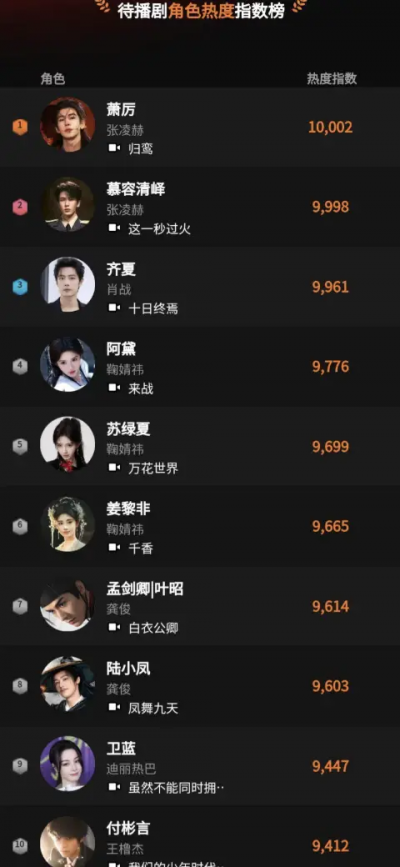 第三名是肖戰在《十日終焉》中飾演的齊夏,第四名是鞠婧禕在《來戰》中飾演的阿黛,她連續攻佔第4到第6名,還有《萬花世界》的蘇綠夏、《千香》的江黎非。