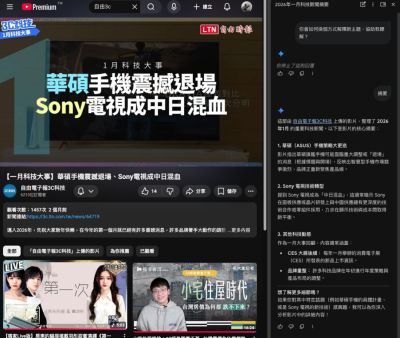 以往要請 Gemini 摘要網頁或是 YouTube,都需要複製連接在切換至 Gemini 頁面等待讀取,現在只要點擊「問問 Gemini」開啟側邊欄輸入請幫我摘要這個網站/這部影片,即可快速獲得重點資訊。實測還發現,用戶可以追問影片細節要求 Gemini 給出時間軸,讓用戶迅速切換至最精華的片段。