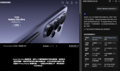 相較於直接在網頁版、App 裡詢問 iPhone 17 Pro Max 與 Galaxy S26 Ultra 的差異,在 Gemini in Chrome 可以指定資訊來源,而不會仰賴雲端資料庫的內容,因此較能避免幻聽或是錯誤資訊出現。
