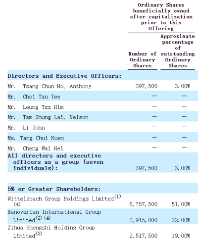 IPO前,Mr. Tsang Chun Ho, Anthony持股3%,Ms. Ma Xiaoqiu持股73%,Mr. Liu Yan持股19%。