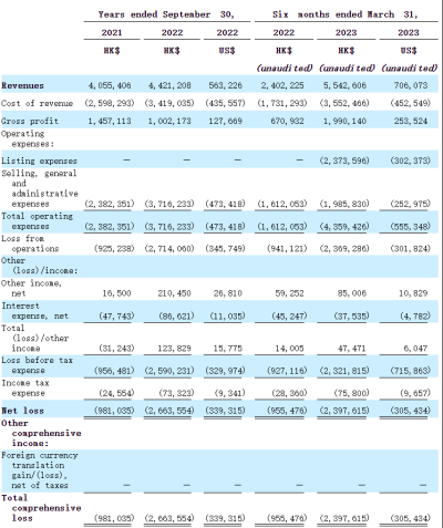2023年3月31日的六個月,其營收爲554萬港元(71萬美元),上年同期爲240萬港元,這期間相應的淨虧損分別爲240萬港元(31萬美元)、96萬港元。