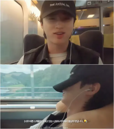 邊佑錫上車後先是悠閒地喫了便當,接著又戴上耳機聽音樂、滑手機,還不時叮囑同行的工作人員要好好喫飯,完全就像普通素人一樣自在,最後更是直接將帽子蓋在臉上睡著,沿途竟真的沒有粉絲認出他來。