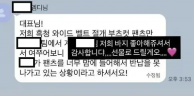 許多韓星的表演服會由公司向品牌方商借,有的是免費贊助,但有的是表演後需要歸還;而Liz近日就被指控,未將品牌商借的褲子還回去。該品牌老闆更公開對話,內容顯示員工向她回報:「因為對方真的太喜歡這條褲子了,現在是處於沒辦法歸還的情況」,老闆因此回應:「既然這麼喜歡,那我們就不收回了,直接送給OO當禮物」。