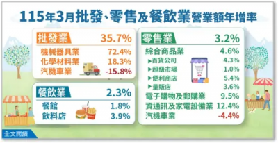統計處上月預估,3月零售預估為年減0.9%至年增2.1%,恐怕會再度翻黑。但今日公布3月數據,3月營收為1兆6,102億元,年增35.7%;零售業營收為4,056億元,年增3.2%;餐飲業營收876億元,年增2.3%,三者紛紛站上正成長。